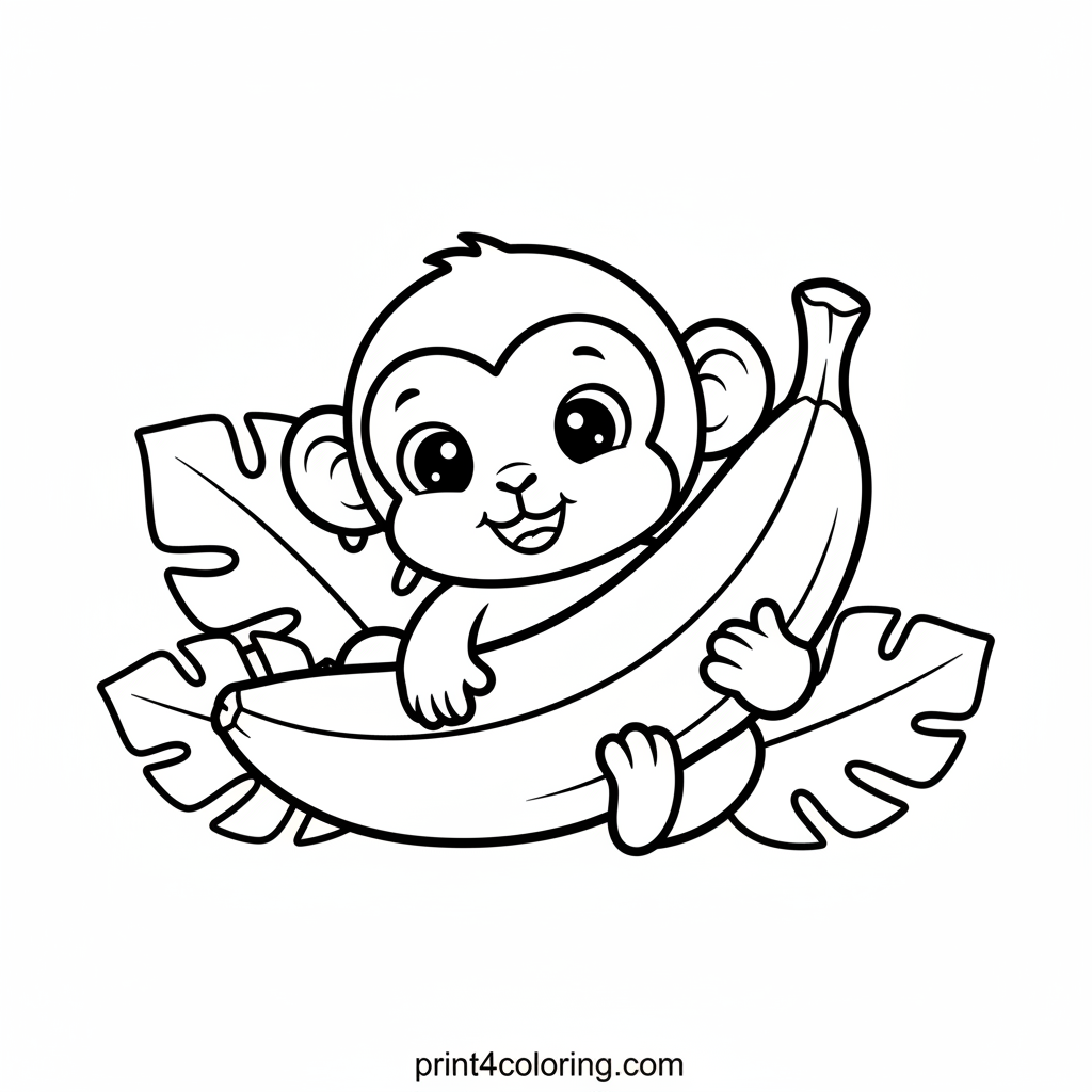 Get ready for an adorable jungle adventure! This sweet baby monkey has big, curious eyes and is giving a giant, ripe banana the biggest hug. Lush, friendly jungle leaves surround our little friend, making for a cozy scene. Grab your crayons and bring this happy moment to life with vibrant colors!