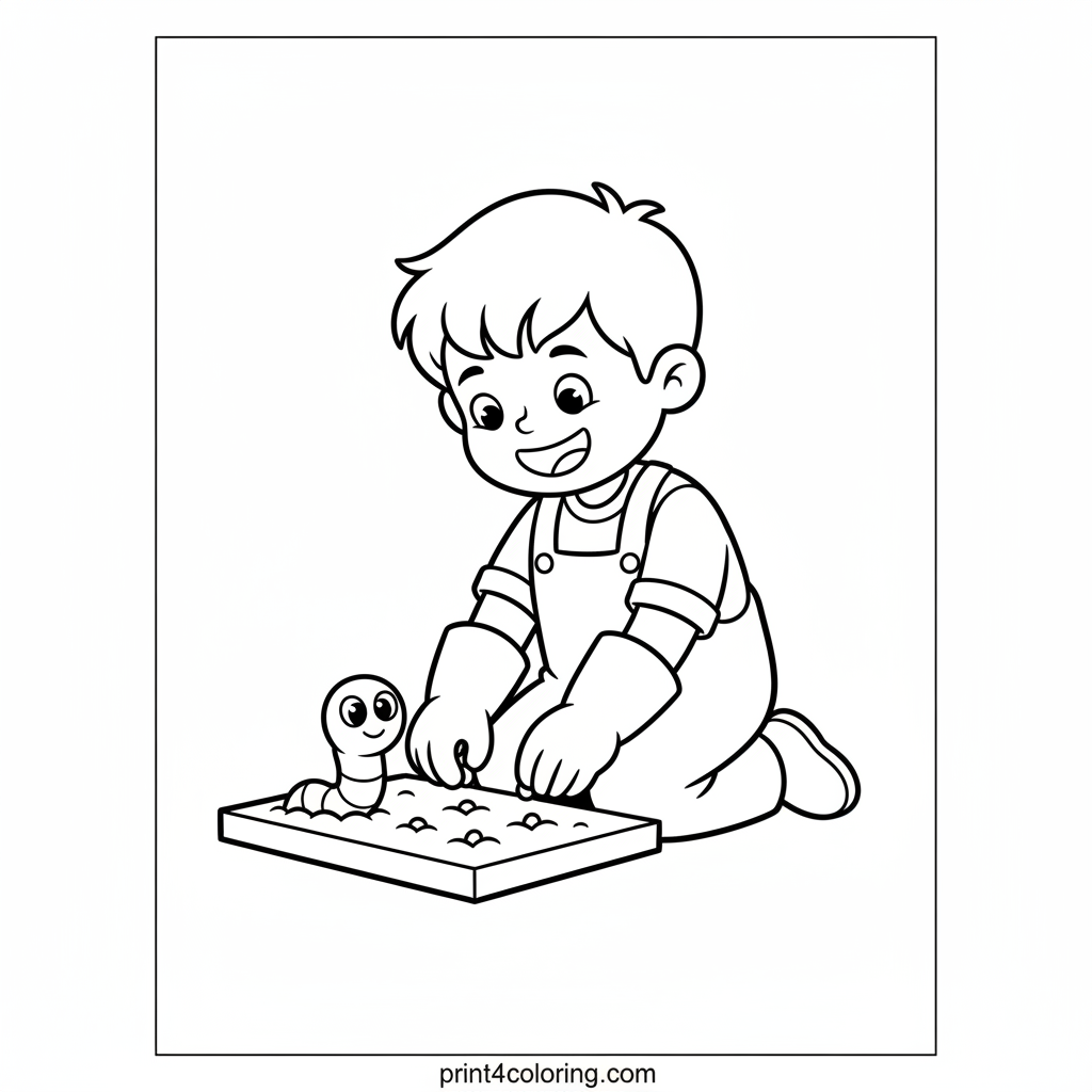 Meet a happy little gardener with a big smile, wearing bright gloves, carefully planting tiny seeds. A friendly wiggle worm peeks out from the rich soil! This heartwarming scene invites you to add vibrant colors to the child's clothes, the earthy soil, and the curious worm. Get ready to grow some fun!