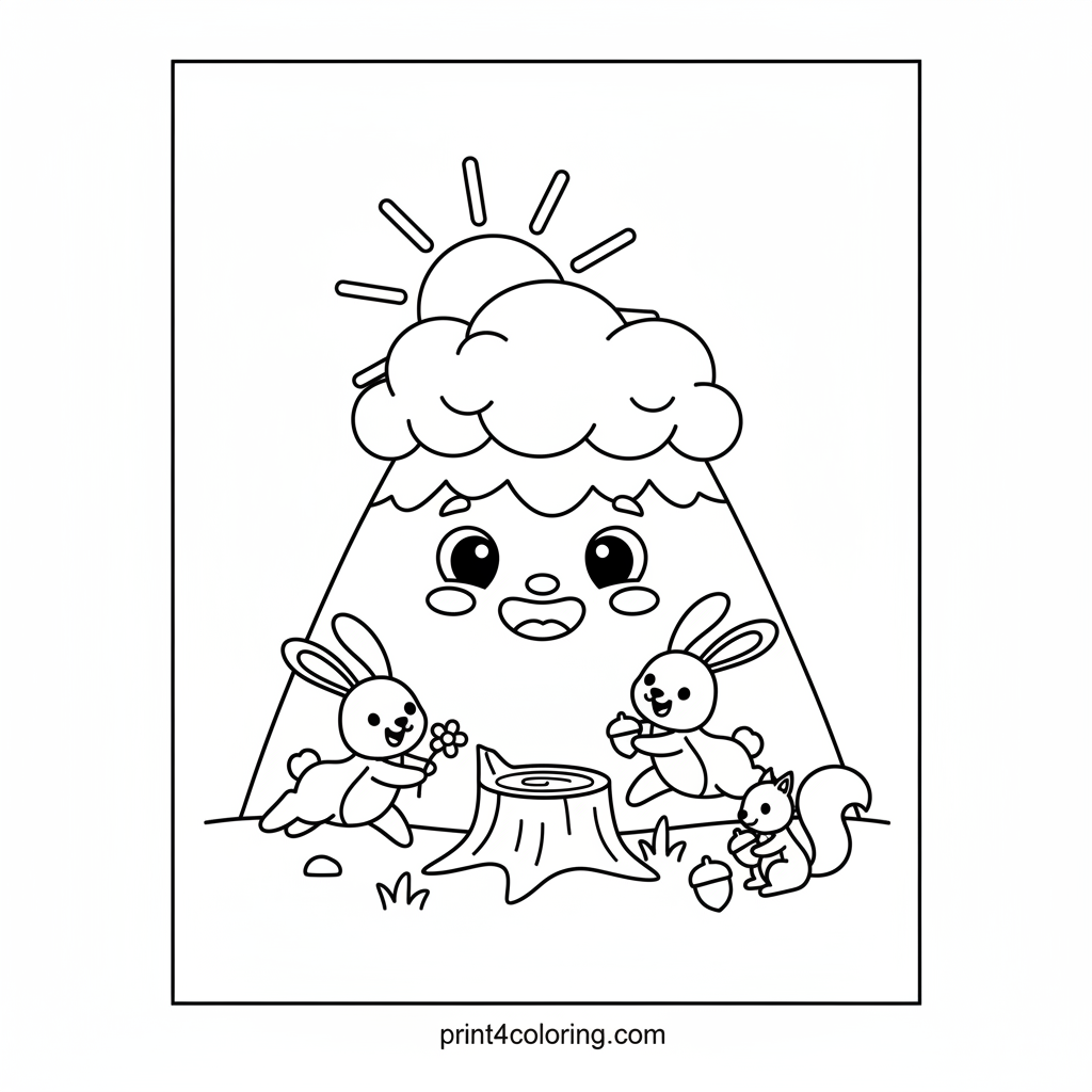 Join a gentle, smiling mountain wearing a fluffy cloud hat! At its base, happy forest friends like playful bunnies and busy squirrels are enjoying a sunny day. This delightful scene invites you to add vibrant colors to the friendly mountain and its cheerful animal companions, creating a world of happy nature fun.