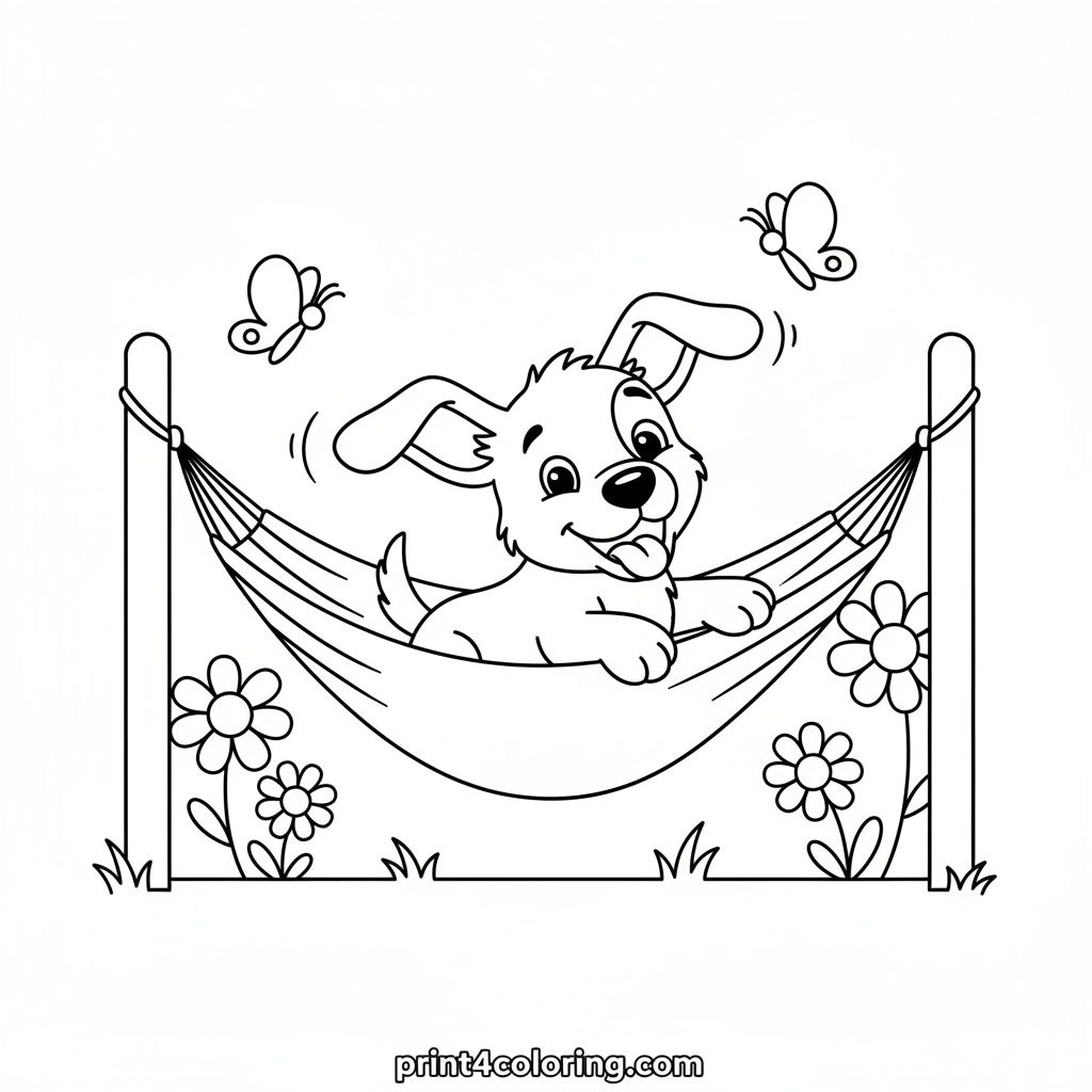 Imagine a super happy puppy with floppy ears, joyfully swinging in a cozy hammock! Its tail wags excitedly as cheerful butterflies flutter nearby in a sunny garden. This playful scene is perfect for young artists to fill with vibrant colors and bring to life. Get ready for a delightful coloring adventure!