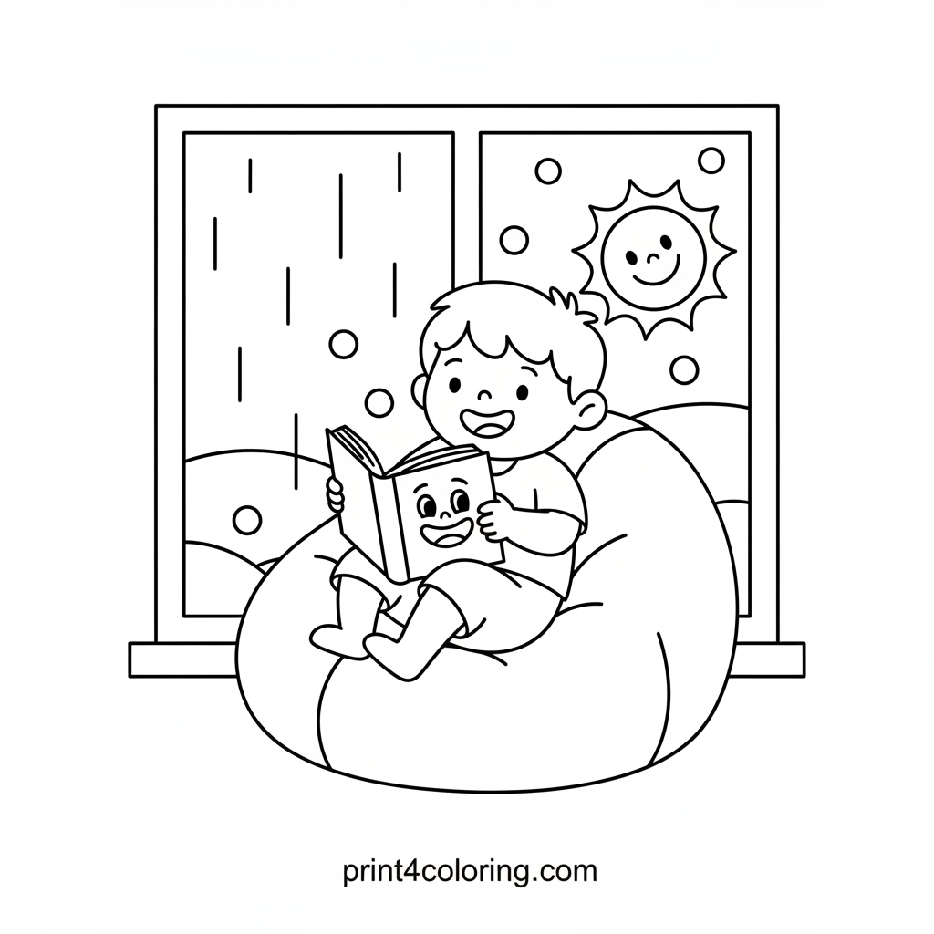 Snuggle up with this delightful coloring page featuring a happy child enjoying a good book! Curled comfortably on a soft beanbag chair, they watch gentle raindrops stream down the windowpane outside. Bring this cozy indoor scene to life with your favorite colors, imagining the quiet joy of reading on a rainy day.