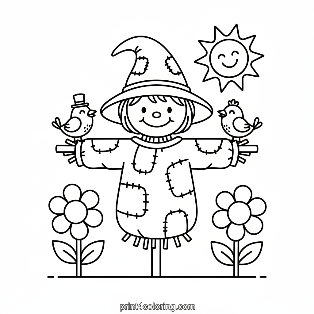 Join a funny, smiling scarecrow in a sunny garden! Dressed in a floppy hat and colorful patchwork clothes, this friendly guardian has playful bird friends perched on its arms. One special bird even wears a tiny hat! A delightful scene ready for your brightest colors.