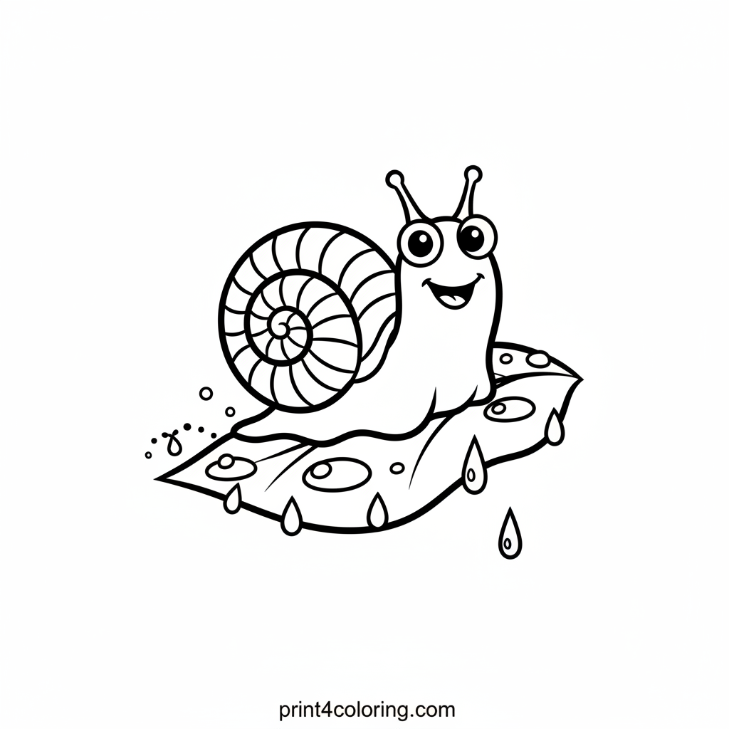 Meet a cheerful snail with big, friendly eyes and a swirly shell, exploring on a gentle rainy day! Watch it slowly glide across a glistening wet leaf, leaving a silvery trail. Color the big raindrops and bring this peaceful scene to life with your favorite hues. A delightful adventure awaits!