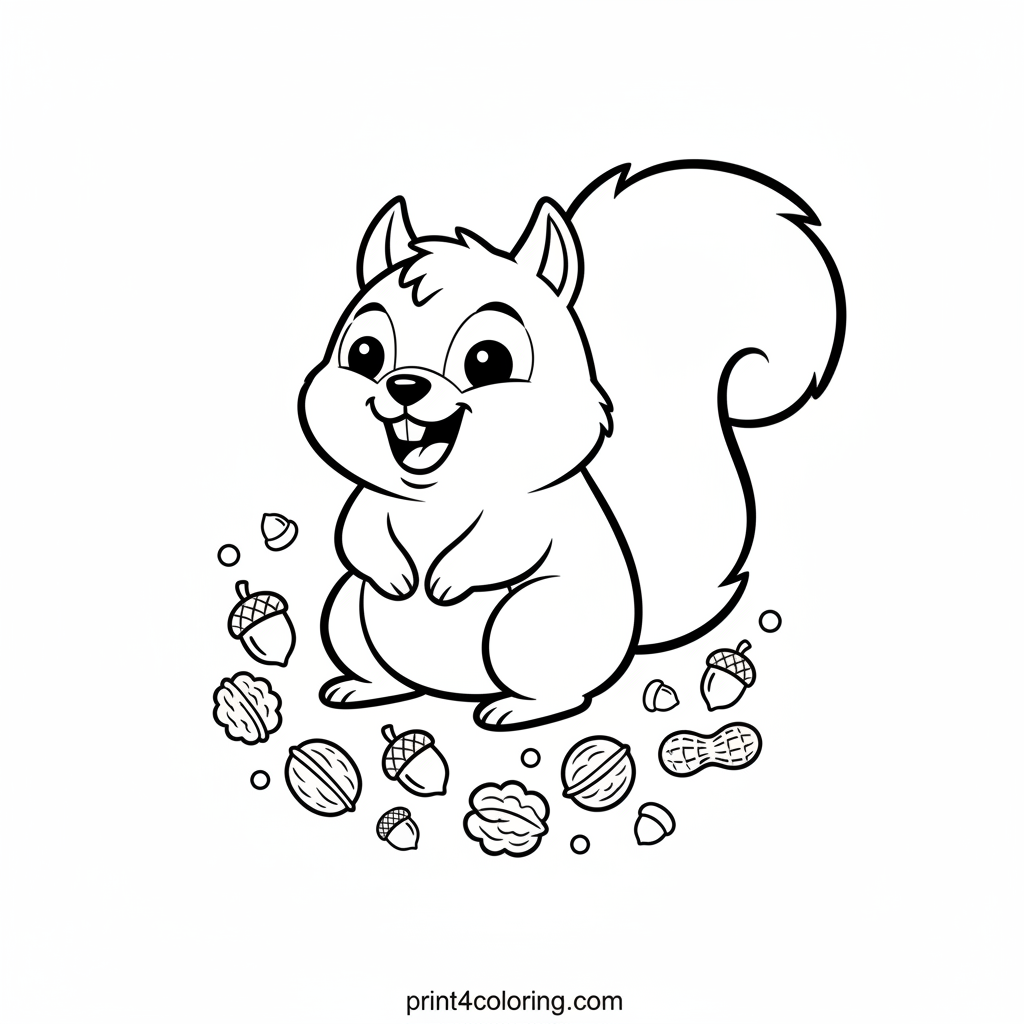 Meet a plump, happy squirrel giggling with delight! A gentle breeze playfully swirls a pile of tasty acorns and nuts around its feet, making them dance in a circle. Imagine the fun of coloring this cheerful scene, bringing to life this whimsical moment. Get ready to add vibrant colors to this nutty adventure!