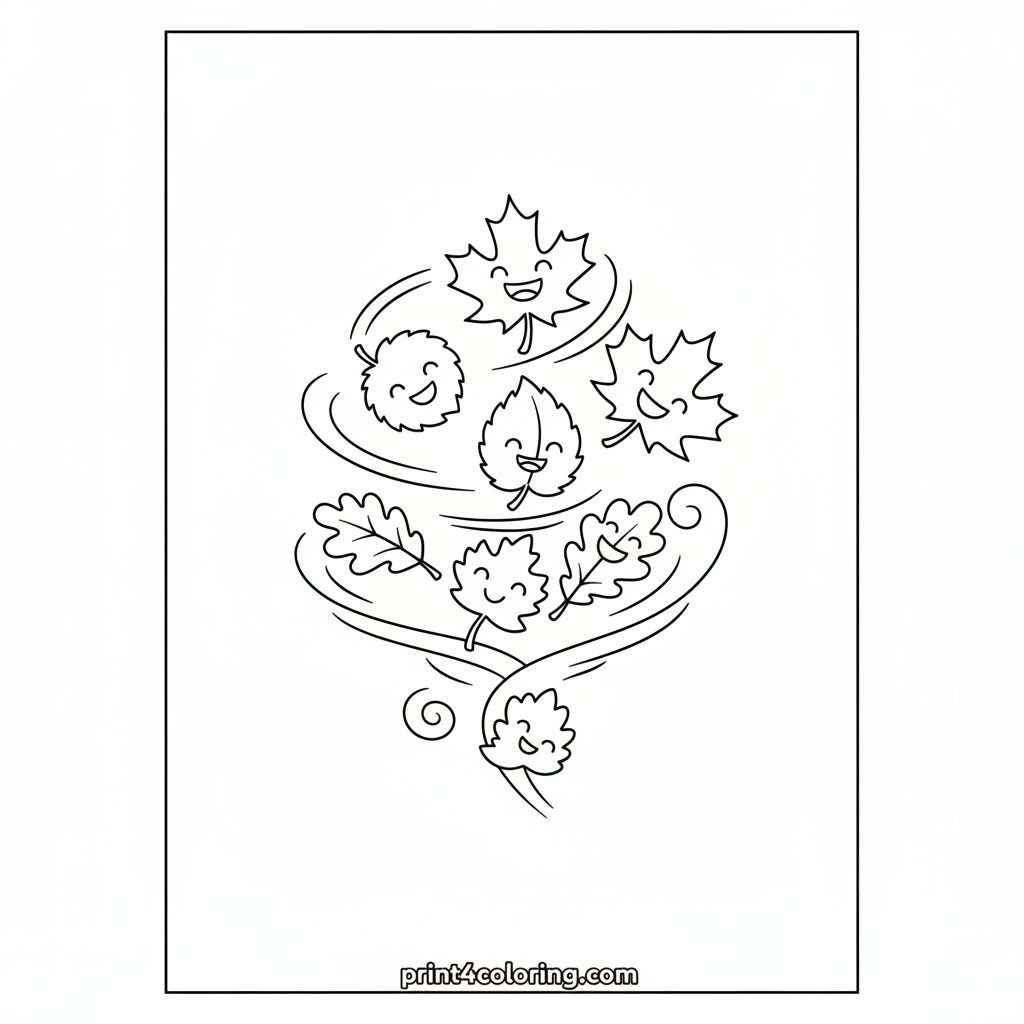 A gentle, playful wind sweeps through the autumn air, inviting a group of cheerful, smiling leaves to dance and twirl! Follow the soft, swirling lines showing the wind's path as it lifts each happy leaf into a joyful ballet. Grab your crayons and bring this delightful fall scene to life with vibrant colors!