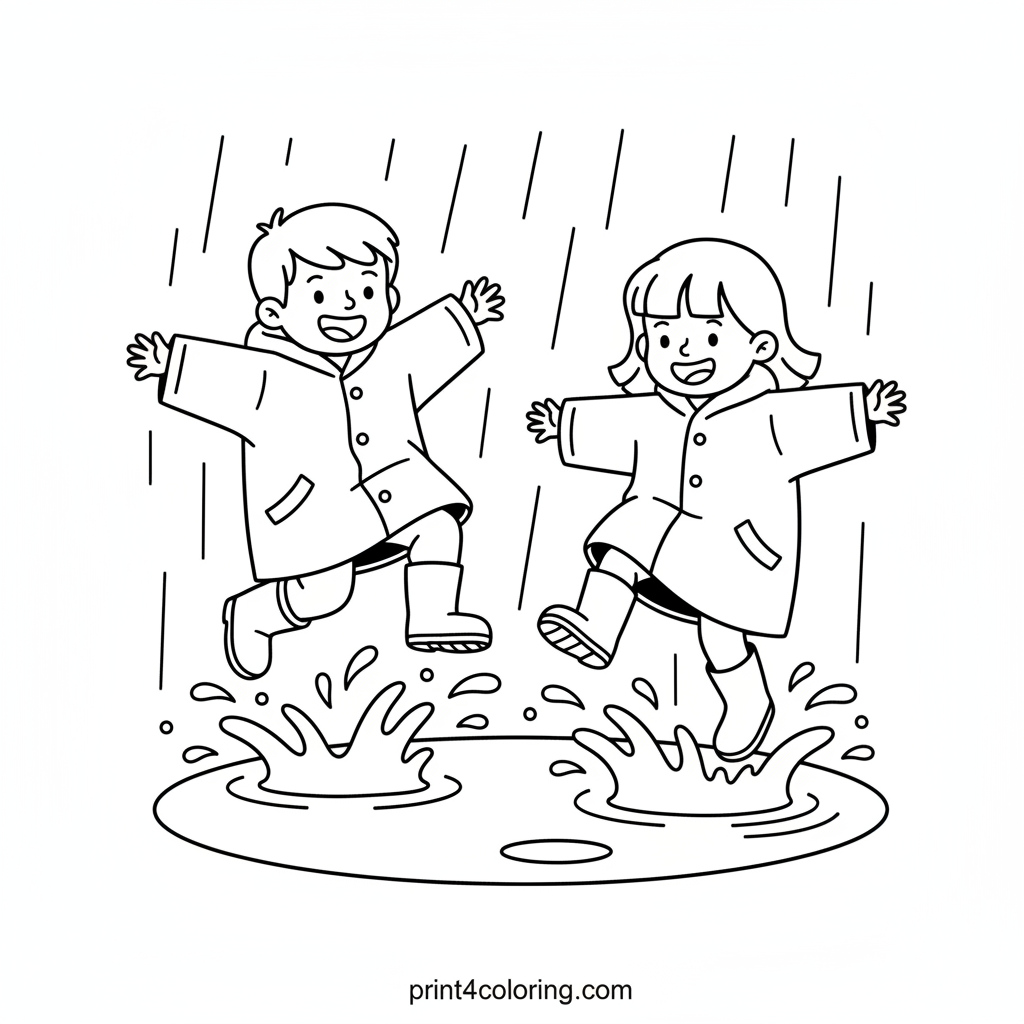 Get ready for a splash of fun! This coloring page shows two happy children, a boy and a girl, mid-air as they leap into a giant puddle. They're wearing bright raincoats and boots, with gentle rain falling all around. Bring their rainy day adventure to life with your favorite colors!