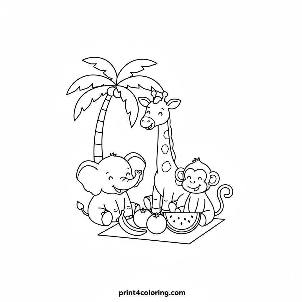 Join a happy elephant, a friendly giraffe, and a giggling monkey for a delightful fruit picnic! Imagine them sharing colorful, yummy fruits under a tall, swaying palm tree in the heart of the jungle. This easy coloring page invites you to bring their joyful gathering to life with your favorite colors. A perfect scene for young artists!