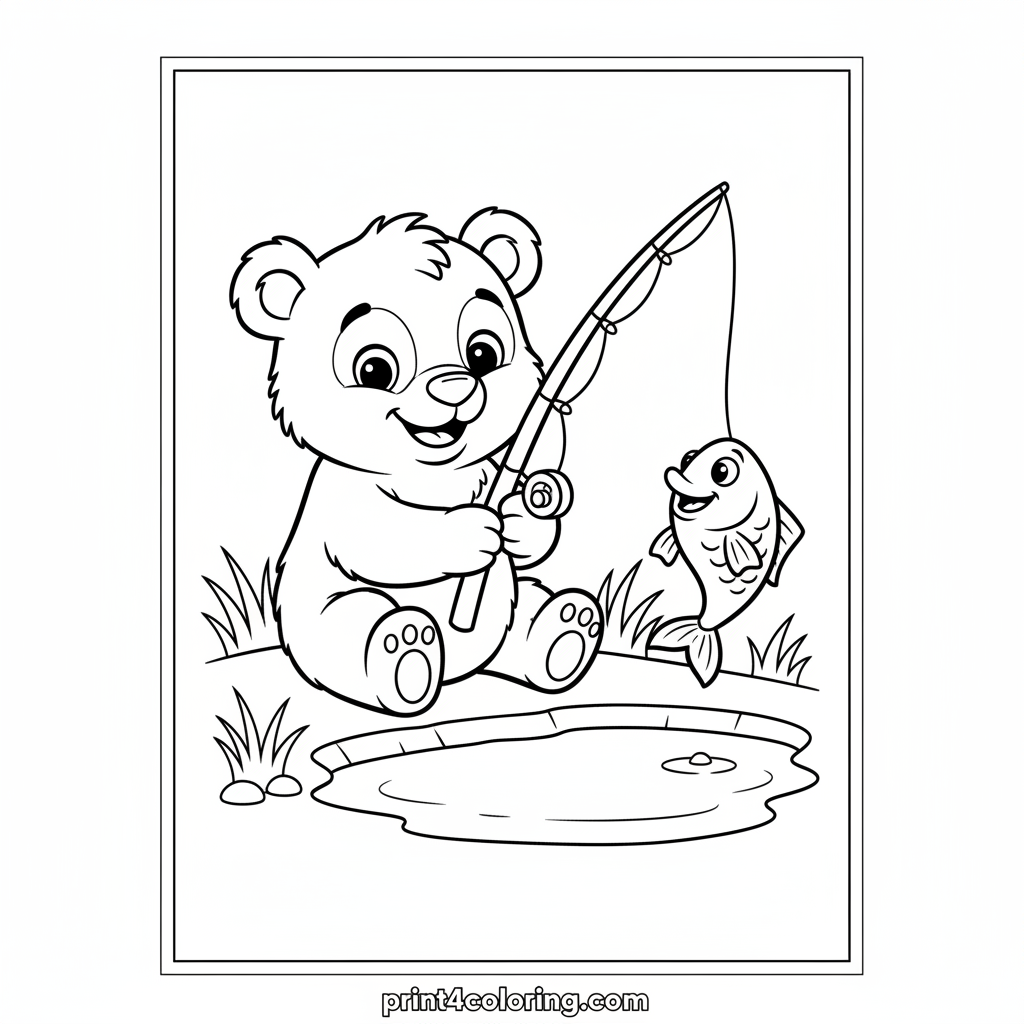 Join our adorable, fluffy bear cub on its first fishing adventure! With big, curious eyes and a happy smile, this little cub sits by a calm pond. It's holding a simple fishing rod, and a friendly, wiggling fish with a big smile is on the line! A heartwarming scene ready for your vibrant colors.