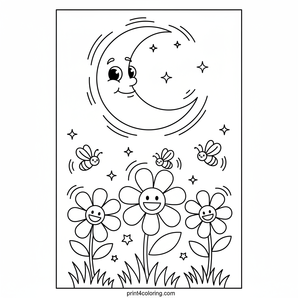 Step into a wondrous meadow where magic comes alive under a friendly crescent moon! Delicate flowers glow with a gentle light, illuminating the path for tiny, sparkling fireflies dancing in the night. This peaceful scene invites you to add your favorite colors to make it truly enchanting and bright.