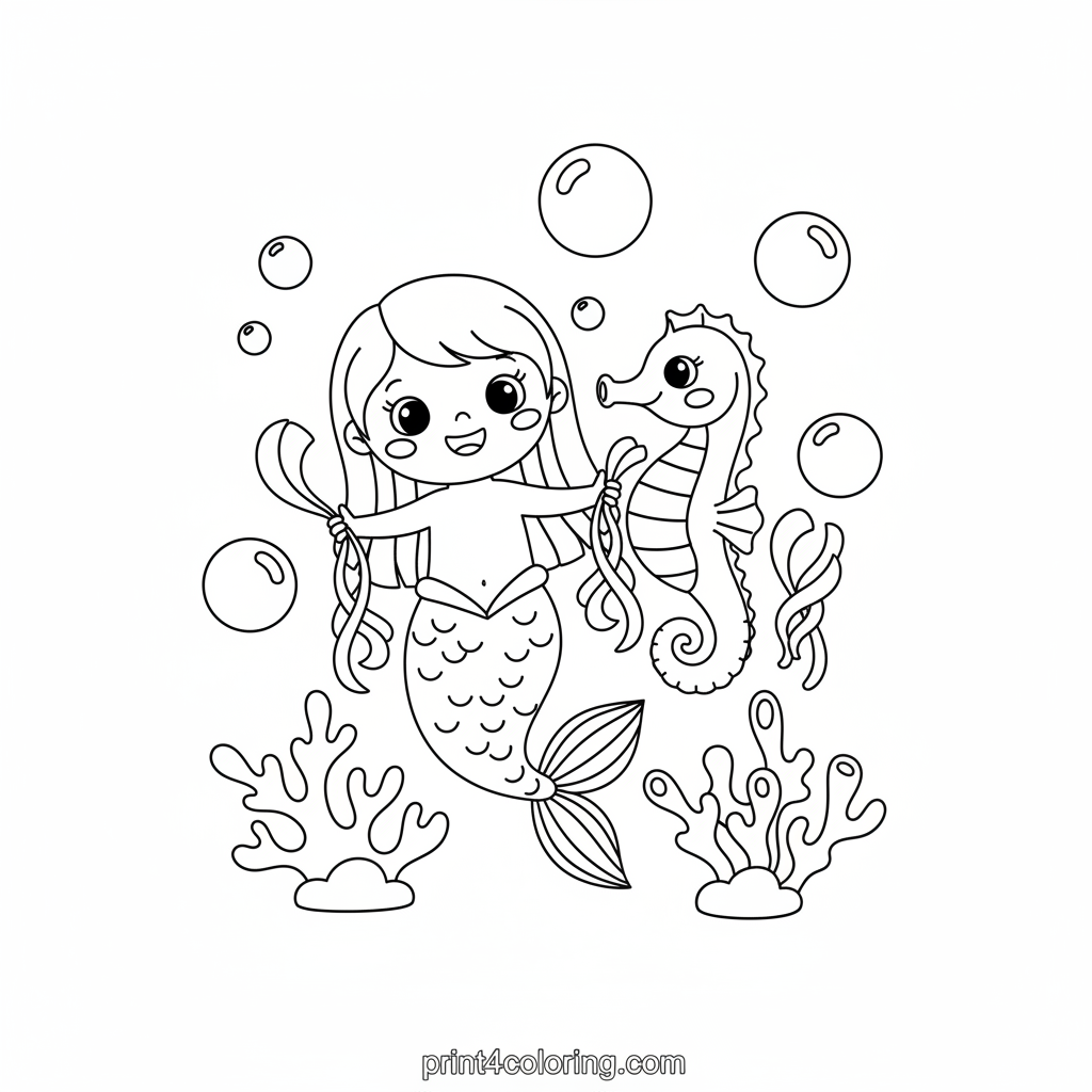 Dive into a magical underwater world where a friendly mermaid and her joyful seahorse friend are having the best summer party! They're surrounded by gentle bubbles and vibrant coral, holding tiny seaweed streamers. Get ready to add your favorite colors to this delightful deep-sea celebration, bringing their happy smiles and the ocean's beauty to life!