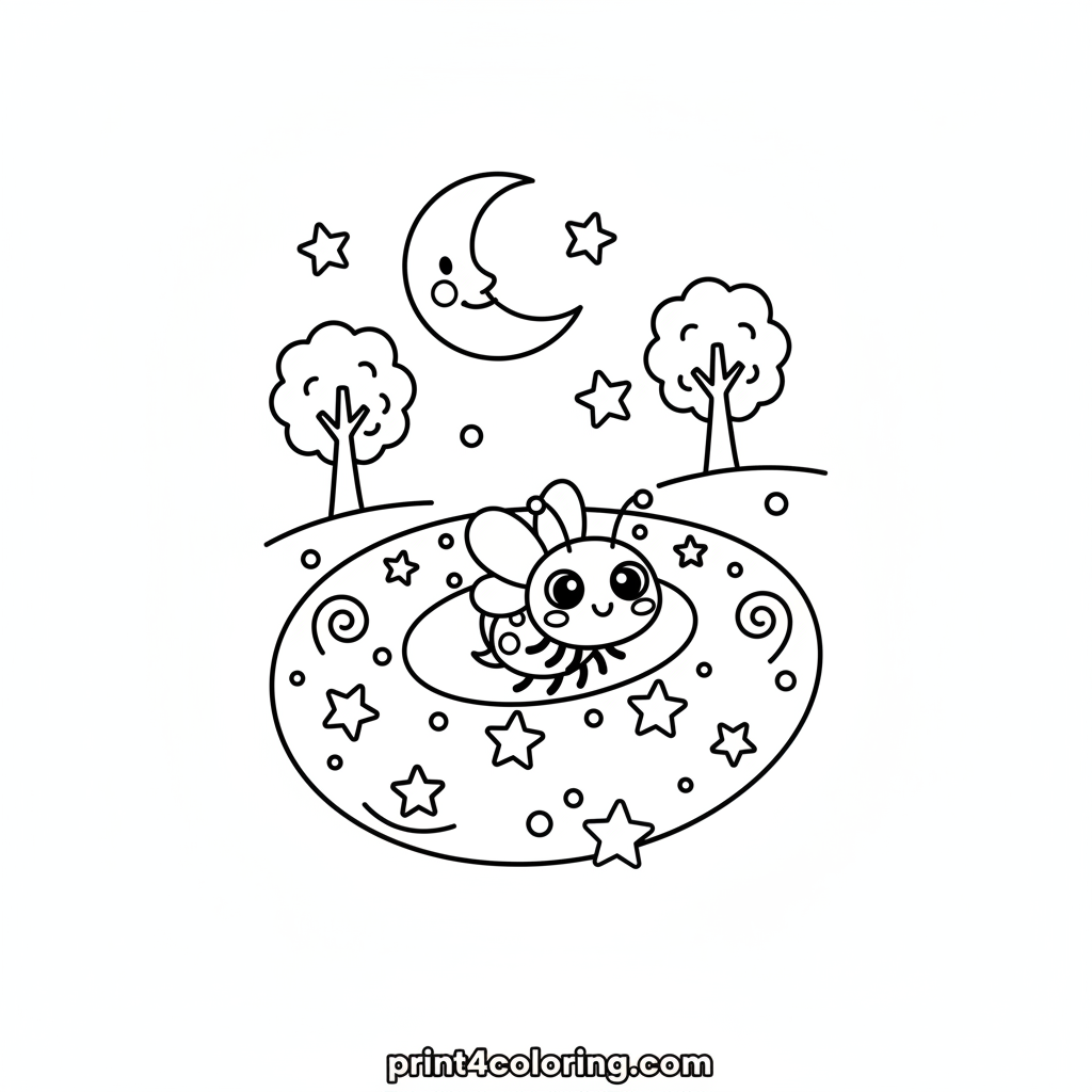Embark on a magical journey with this enchanting coloring page! A gentle swirl of sparkling dust and stars forms a whimsical path, guiding a tiny, friendly fairy or a glowing firefly through a serene, moonlit forest. Imagine the soft glow and shimmering magic as you bring this wondrous scene to life with your favorite colors.
