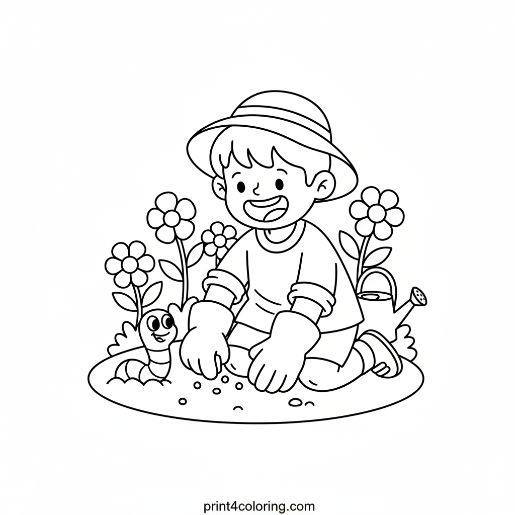 Join a cheerful little gardener as they embark on their first planting adventure! With a big smile and bright garden gloves, they carefully place tiny seeds into the soft soil. A curious, friendly worm peeks out to say hello, excited to see the new plants grow. Color this wonderful scene of nature and new beginnings!