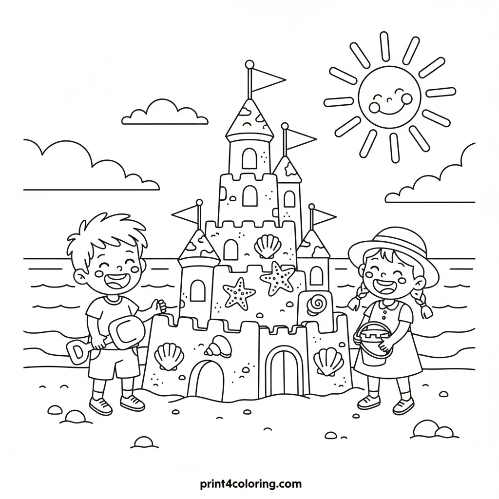 Join two happy children on a sunny beach building the biggest sandcastle ever! With shovels and buckets, they craft a grand, tall fortress adorned with flags and beach treasures. The calm ocean shimmers behind them, ready for your colors to complete this seaside masterpiece.