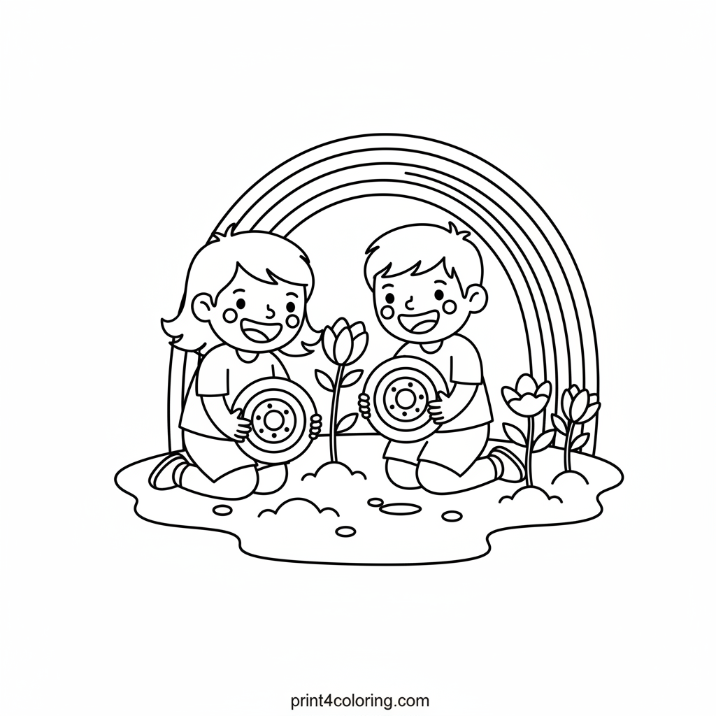 Join a happy boy and girl as they plant a magical rainbow garden! Watch colorful seeds transform into vibrant rainbow flowers, with tiny sprouts already peeking through the soil. A beautiful, gentle rainbow arches across the sky, adding extra sparkle to their gardening adventure. Get ready to add your favorite colors to this cheerful scene!