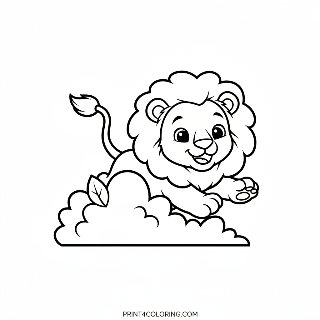 Get ready for jungle fun! This adorable coloring page features a cheerful lion cub with a fluffy mane, playfully pouncing out from behind a big, leafy bush. Watch its tail wag with excitement as it discovers new adventures. Grab your crayons and bring this mischievous little big cat to life!