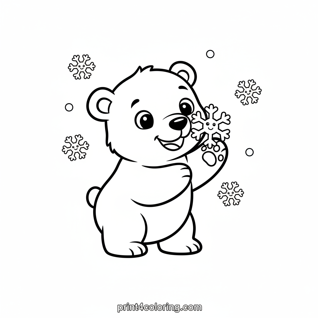 A heartwarming winter scene awaits your colors! A happy, smiling polar bear cub, with big, round eyes, gently tries to catch a fluffy snowflake on its tiny nose. Watch as more beautiful snowflakes softly fall around this adorable little bear. A sweet, snowy moment perfect for creative fun!