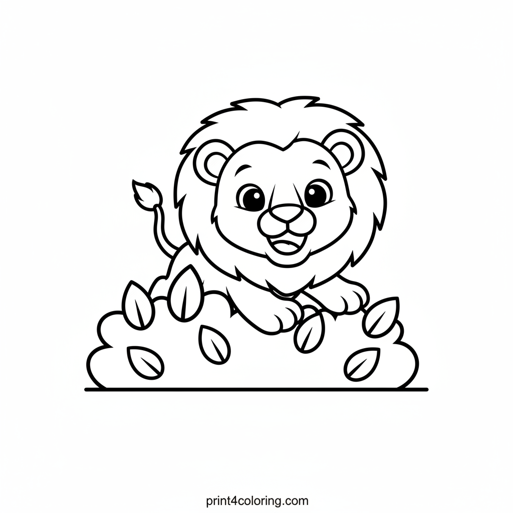 Get ready for some wild fun with this adorable coloring page! A cheerful lion cub, with a fluffy mane just starting to grow, is playfully pouncing out from behind a big, leafy bush. Its tail wags with pure excitement, ready to play. Bring this happy little adventurer to life with your favorite colors!
