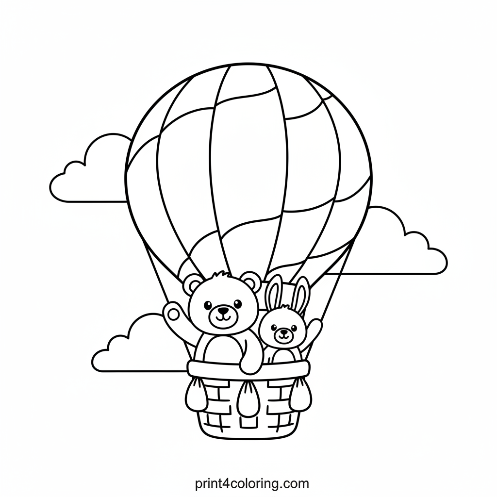 Join a cute, smiling teddy bear and his little bunny friend on an amazing sky adventure! They're waving happily from a giant, striped rainbow hot air balloon, floating gently among fluffy clouds. Get ready to add your favorite colors to this joyful journey!