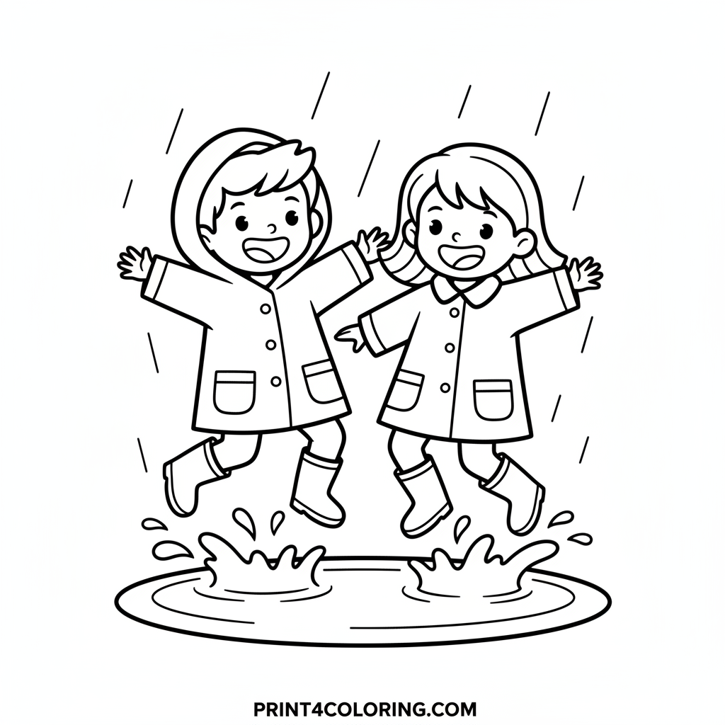 Get ready for a joyful splash! This coloring page shows two happy children, a boy and a girl, leaping high into a big, round puddle. Dressed in their bright raincoats and boots, they are mid-air, surrounded by gentle falling rain. Bring this cheerful rainy day scene to life with your favorite colors!