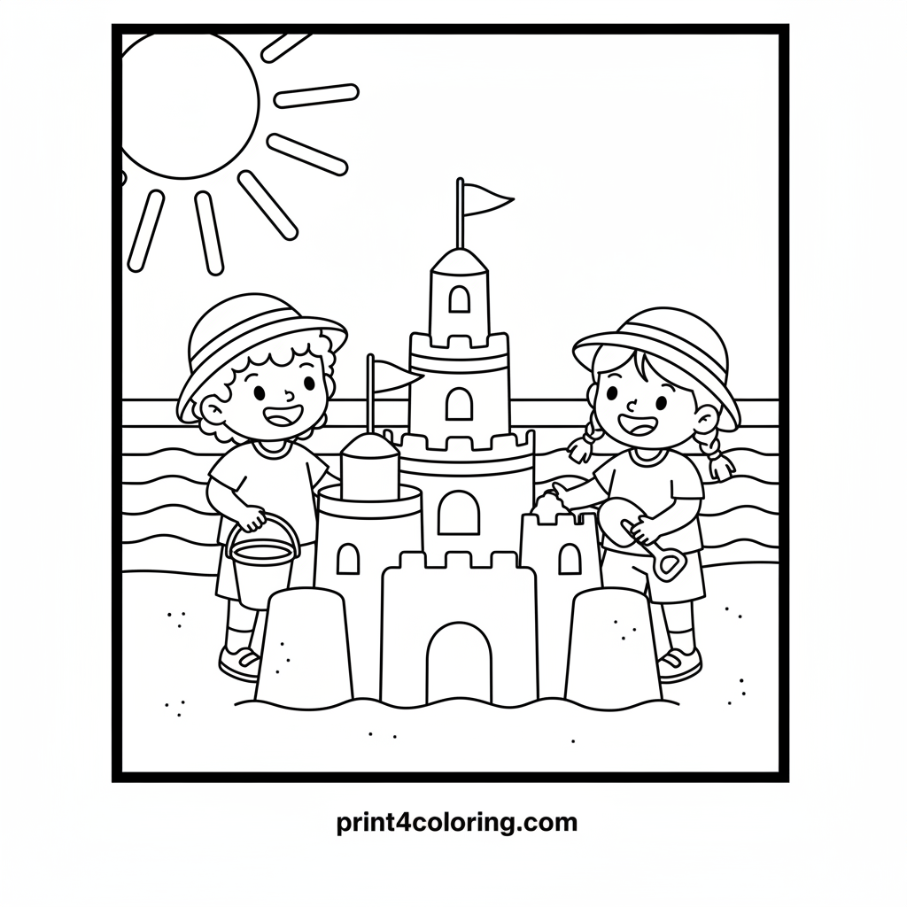 Join two joyful friends on a sunny beach adventure! Watch them team up, one with a bucket and the other a shovel, to build a magnificent, towering sandcastle. Gentle waves lap in the background, creating a perfect scene for play. Grab your crayons and bring this sandy masterpiece to life!
