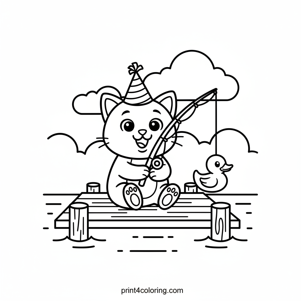 Get ready for giggles! This hilarious coloring page features a funny, cartoon cat in a tiny hat, patiently fishing from a wooden dock. Instead of a fish, it has playfully caught a friendly, smiling rubber duck! The cat looks comically surprised. Add vibrant colors to this whimsical moment!