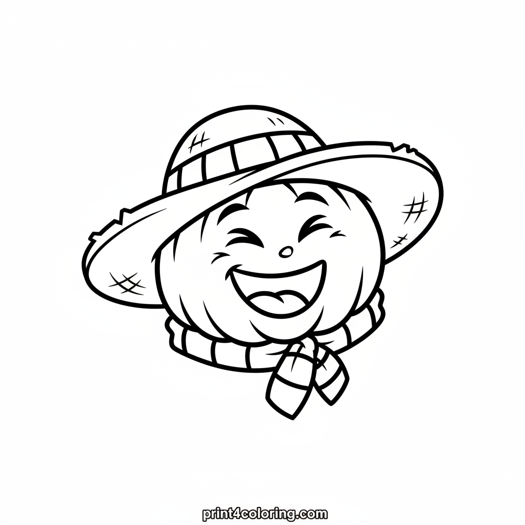 Get ready for some autumn fun with this adorable coloring page! Meet a plump, happy pumpkin with a big, friendly smile. This silly pal wears a floppy straw hat and a tiny, colorful scarf, looking playfully surprised. Bring this cheerful harvest friend to life with your favorite colors and make it extra bright!