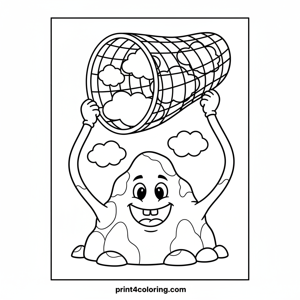 Join our goofy, friendly mountain character as it stretches its long, silly arms high into the sky! With a giant, colorful net, this playful mountain is on a mission to catch the fluffiest, dreamiest clouds. Imagine all the soft colors you can use to bring this whimsical scene to life. Get ready for a delightful coloring adventure!