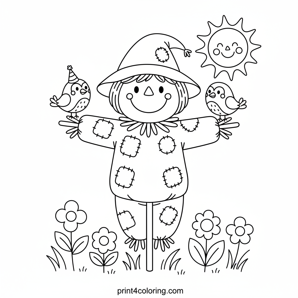 Meet our cheerful scarecrow, Mr. Patches, enjoying a bright, sunny day in the garden! He wears a big floppy hat and colorful patchwork clothes. Happy birds playfully perch on his arms; one tiny bird even has its own miniature hat! Bring this joyful garden scene to life with your favorite colors.