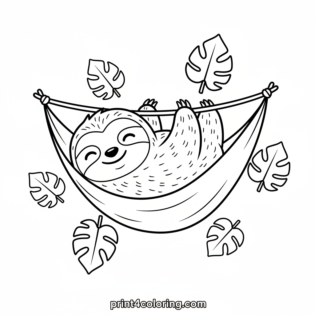 Join our adorable, fluffy sloth for some upside-down fun! This happy sloth is smiling wide, gently rocking in its comfy hammock amidst simple jungle leaves. Get ready to add vibrant colors to its soft fur and the lush greenery, bringing this super chill scene to life. It's a perfect picture for little artists!