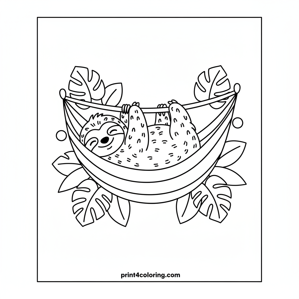 Join our super silly sloth for an extra-relaxed moment! This fluffy friend is happily hanging upside down in a comfy hammock, gently swaying amidst simple, leafy jungle greens. Get ready to color its comical, peaceful face and the lush surroundings. A perfect page for a calm and creative coloring adventure!