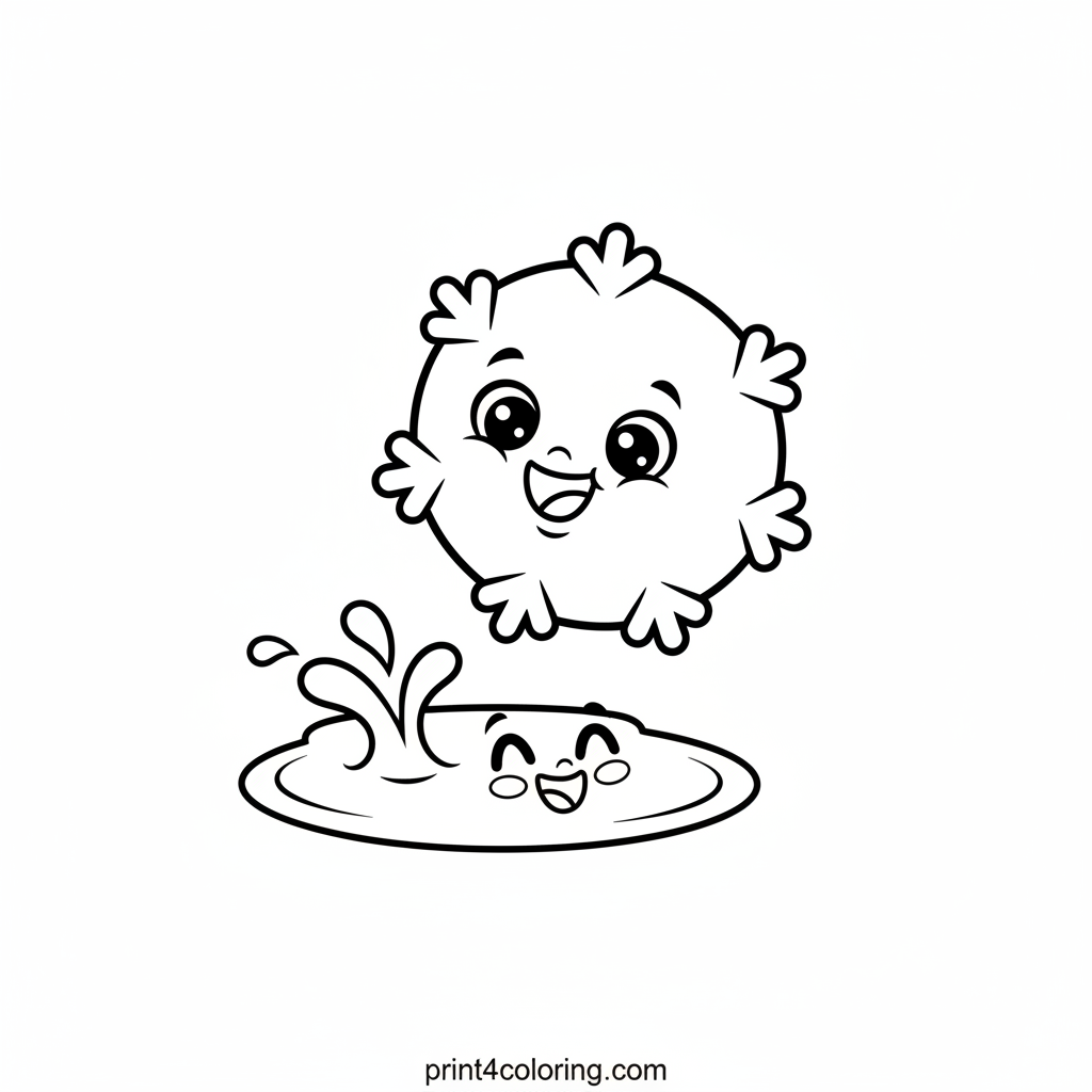 Dive into a whimsical winter scene with Silly Snowflake! Watch as this cheerful cartoon snowflake, with a wonderfully surprised but happy expression, makes a gentle landing in a friendly puddle. Tiny, cute water droplets dance in the air, creating a funny little splash. Get ready to add vibrant colors to this delightful chilly adventure!