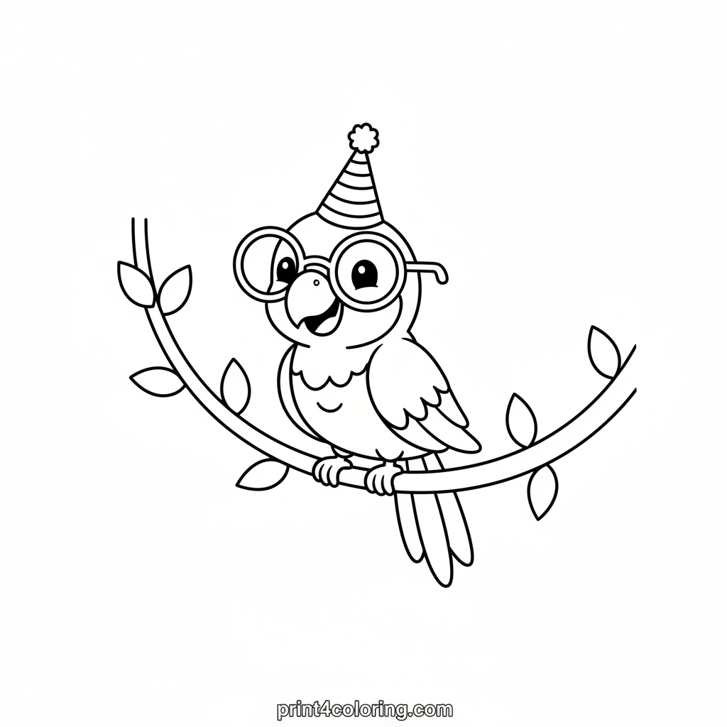 Get ready for a giggle with this hilarious parrot! Perched on a thick jungle vine, this friendly bird is sporting super silly, oversized glasses and a tiny, colorful party hat. Imagine all the bright colors you can use to bring this feathered friend to life. It's a tropical party waiting for your crayons!