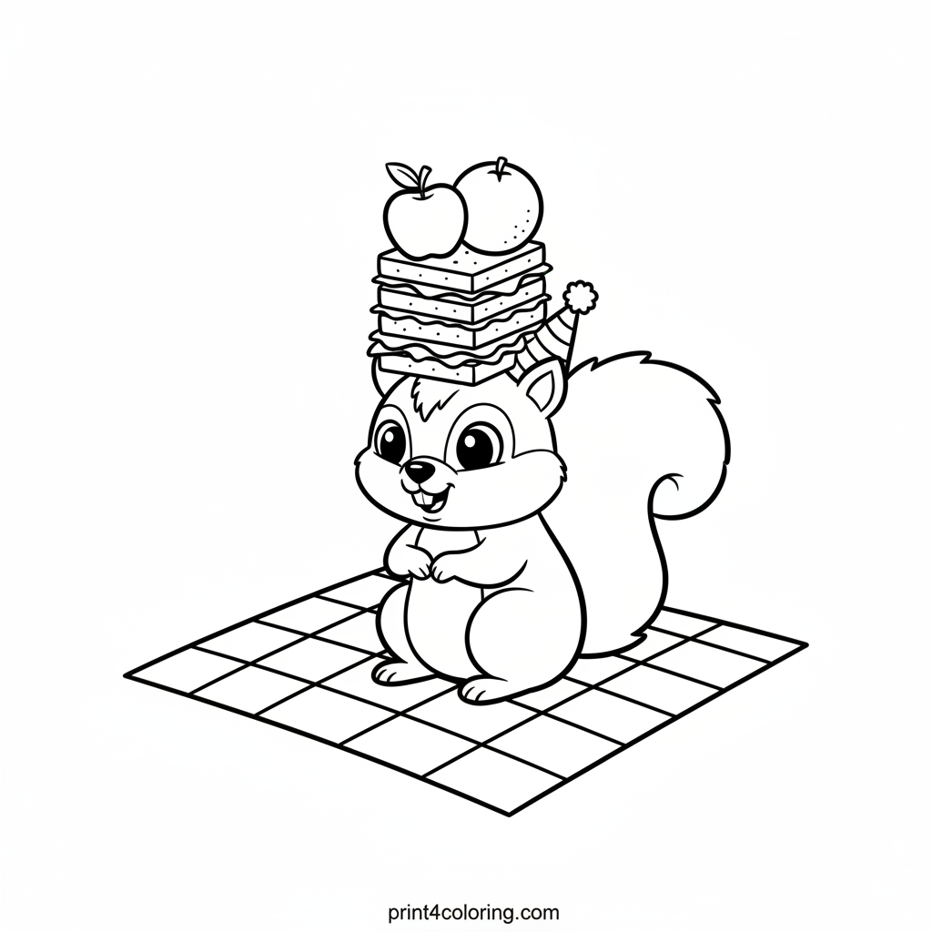 Join a mischievous squirrel, wearing a tiny party hat, as it attempts a hilarious balancing act! Watch it carefully carry a tall stack of colorful sandwiches and juicy fruits on its head, ready for a sunny picnic. This delightful scene is packed with fun details for you to color and bring to life, perfect for little artists.