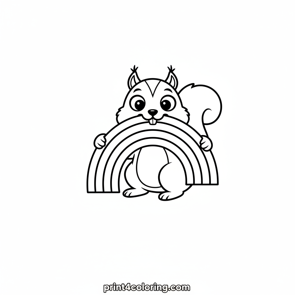 Meet a super silly squirrel with big, surprised eyes! This little guy is having a funny moment, playfully trying to take a bite right out of a vibrant rainbow. Watch his cute, confused expression as he tries to figure out this colorful snack. Get ready to add your brightest colors to make this scene even more magical!