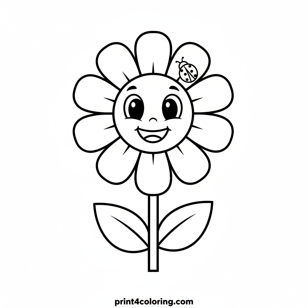 Meet your new Smiling Blossom Friend! This joyful flower has a big, happy face and friendly eyes, ready to brighten your day. A sweet little ladybug has found a cozy spot on one of its soft petals. Imagine all the beautiful colors you can use to bring this cheerful scene to life!