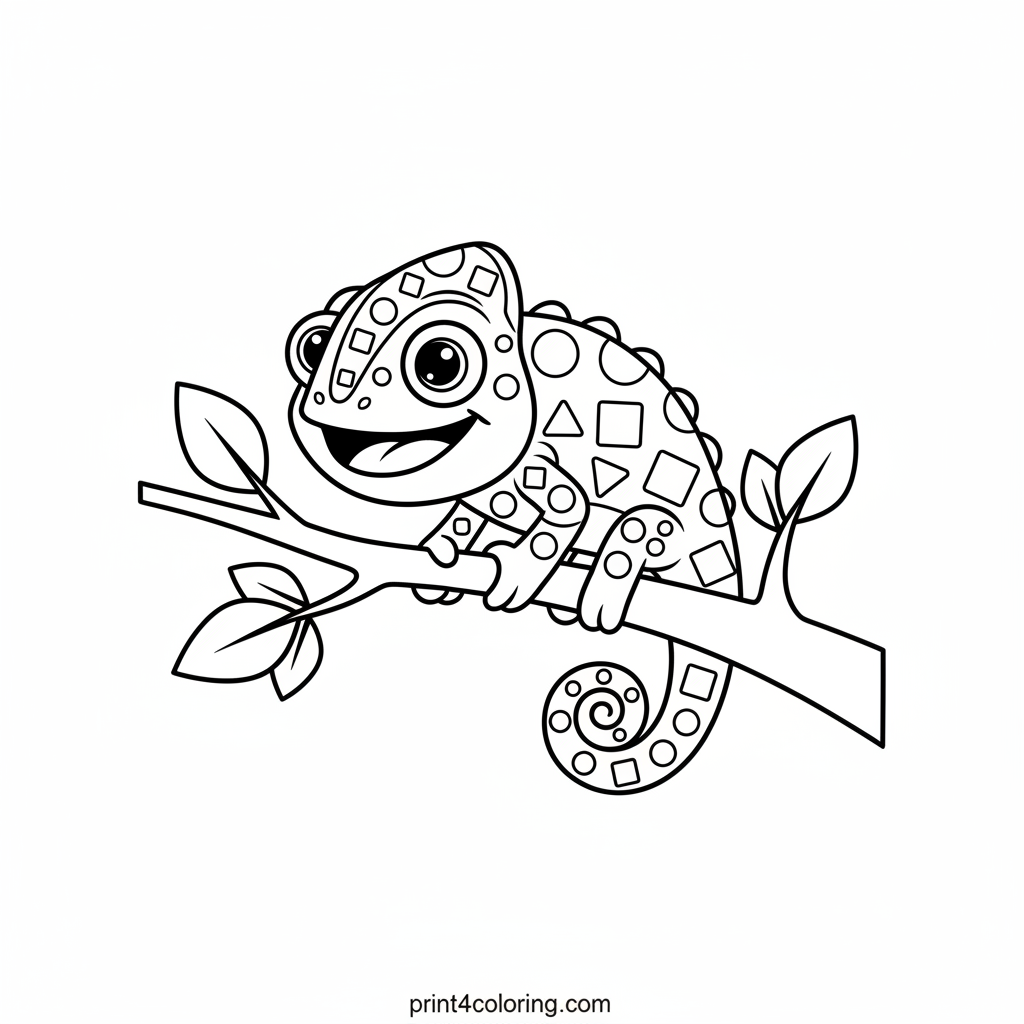 Meet a cheerful chameleon with a big smile, perched happily on a thick tree branch! Its skin shows a fun, simple pattern of changing colors, blending into its surroundings. This easy coloring page invites you to imagine all the vibrant hues this clever creature can display. A delightful scene for young artists!