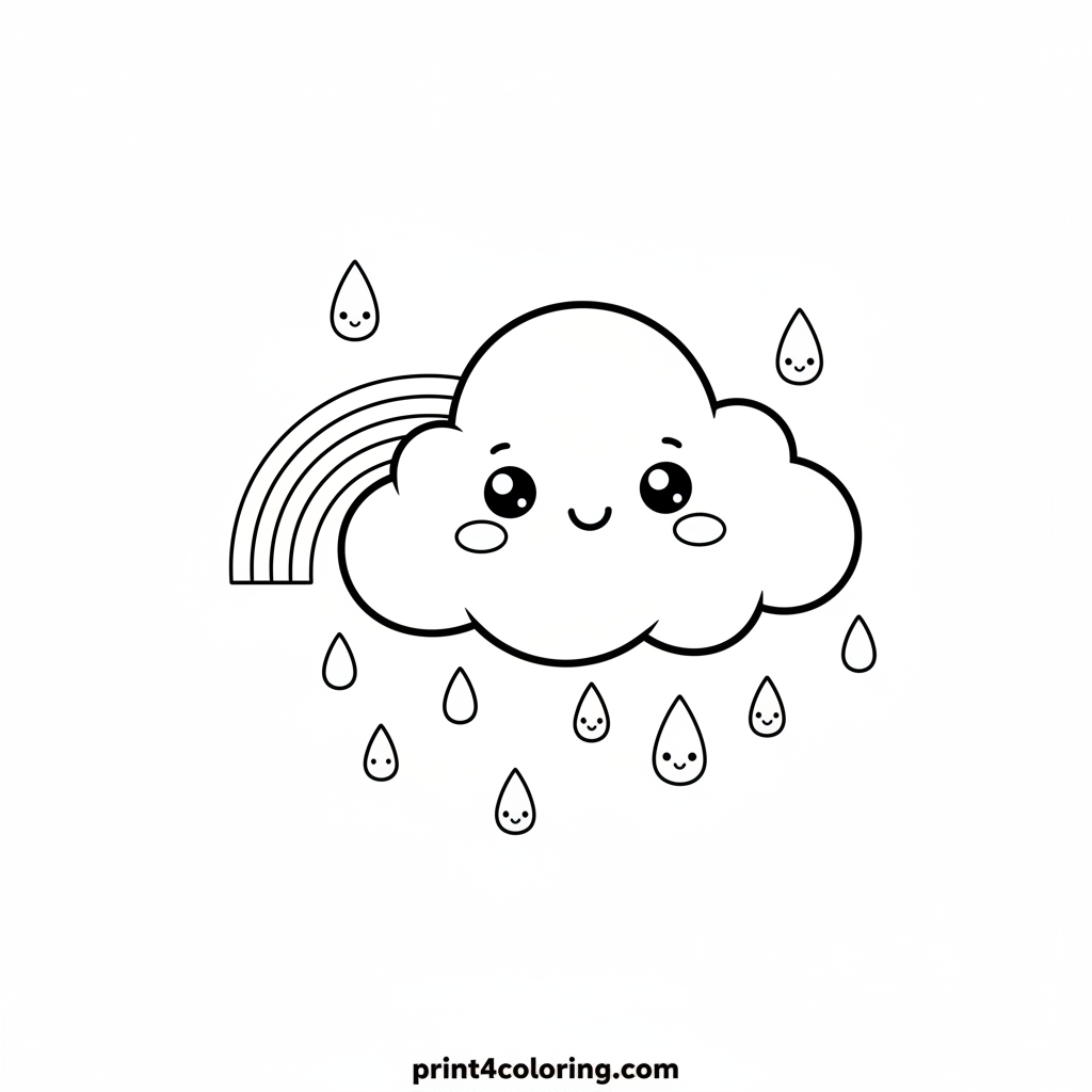 Meet a very happy, plump cloud with big, friendly eyes and rosy cheeks! A small, cheerful rainbow is emerging from its side, bringing a splash of color to the sky. Look closely, and you'll see gentle raindrops falling all around, each with a tiny smile. Get ready to color this joyful scene!