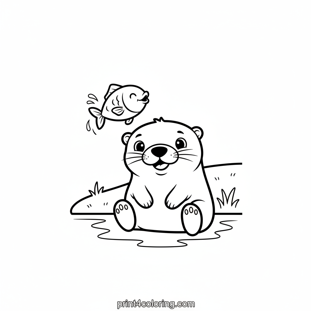 Join a cheerful otter with a big grin, sitting peacefully by the water's edge. Watch in delight as a happy, cartoon-style fish leaps high out of the water, making gentle splashes! This playful scene captures a moment of joy between two water-loving friends. Grab your crayons and bring this watery adventure to life!