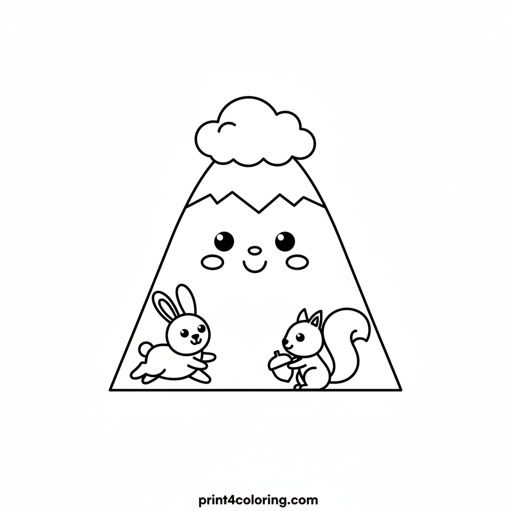Meet a gentle, smiling mountain wearing a fluffy cloud hat, surrounded by happy forest friends! Playful bunnies hop and cheerful squirrels scamper at its base. Bring this heartwarming scene to life with your favorite colors, making the mountain and its pals even more joyful and vibrant!