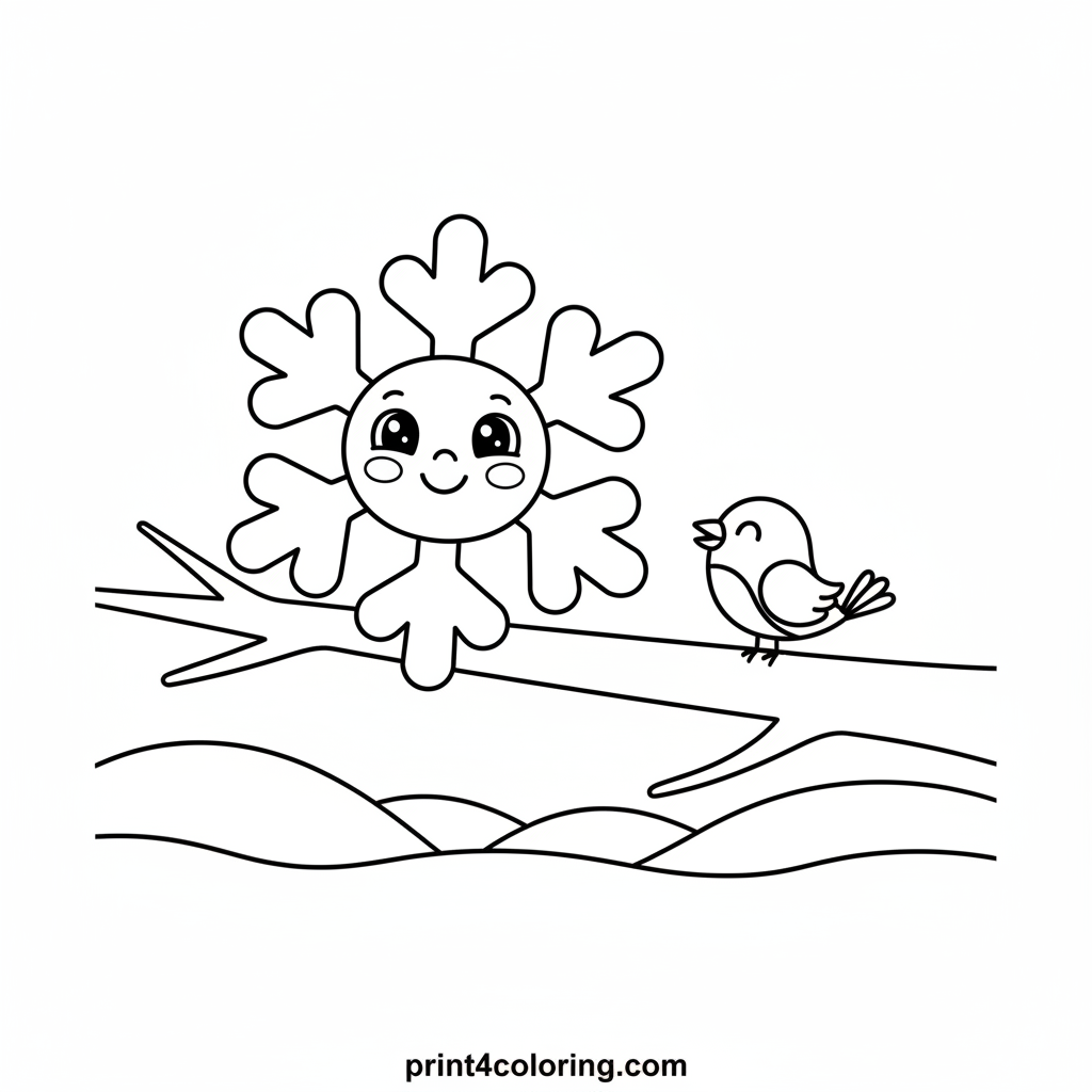 Imagine a serene winter day! A big, friendly snowflake rests gently on a tree branch, keeping a watchful eye on a happy little bird nestled nearby. This cozy scene invites you to add your favorite winter colors and bring the peaceful moment to life.