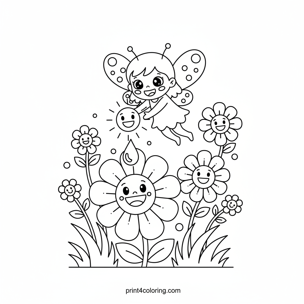 Imagine a tiny, happy fairy, Sparklewing, with her shimmering wings! She's in a magical garden, gently watering oversized, whimsical flowers. Watch as each magic droplet makes the petals glow with vibrant light. This enchanting scene invites you to add your brightest colors and bring this wondrous garden to life.