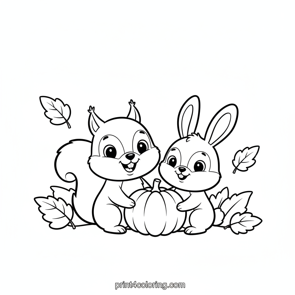 Join a cheerful squirrel and a cute bunny as they enjoy a delightful autumn picnic! They're sharing a small, round pumpkin in a cozy forest clearing, with golden leaves gently falling all around them. A perfect scene for little artists to bring to life with colors!