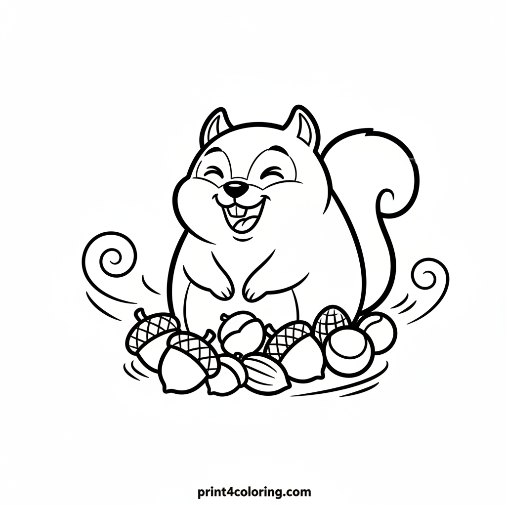 A plump, happy squirrel is having a marvelous time! A gentle breeze has started a playful swirl, making all the acorns and nuts at its feet dance in a whimsical circle. Watch the squirrel giggle with delight as its tasty treasures twirl around. Grab your crayons and bring this joyful, nutty scene to life!