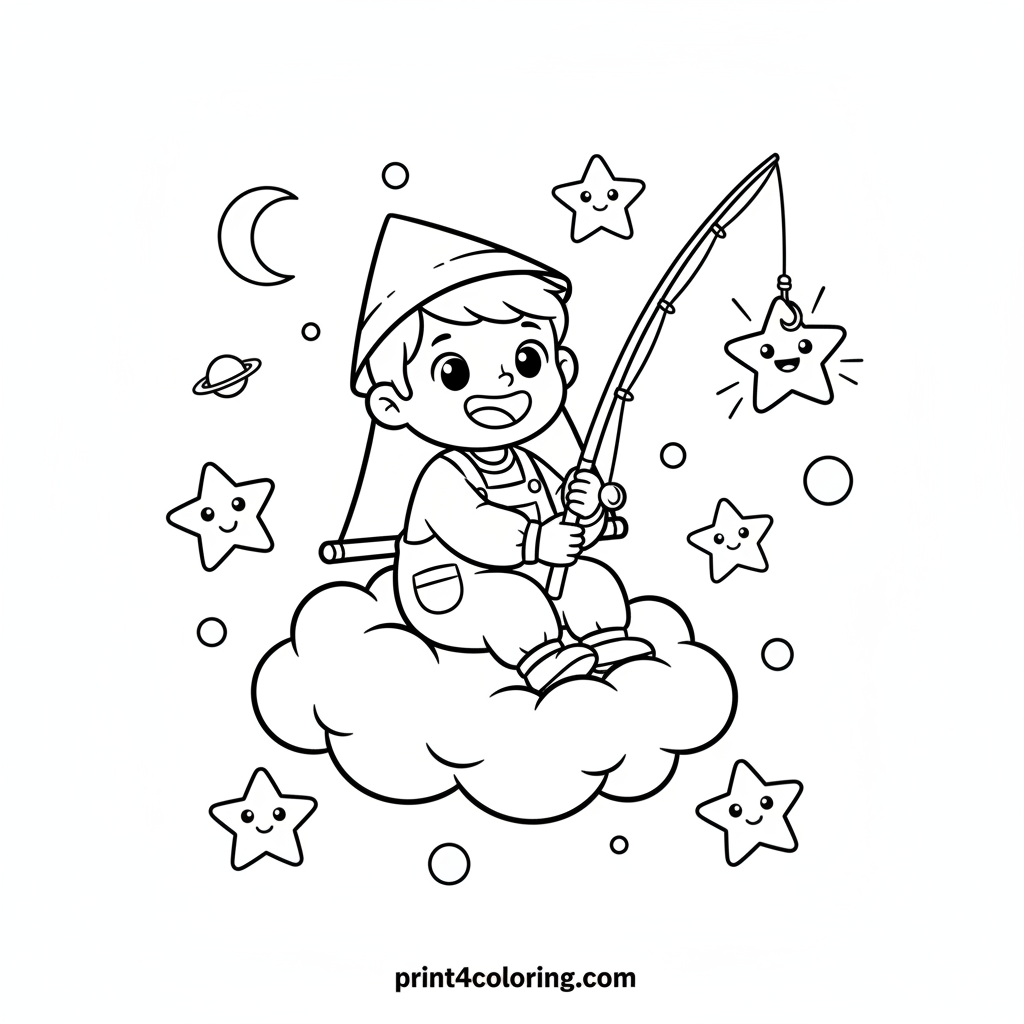 Float high above the world with our friendly star catcher! In a cozy cloud boat, they're gently fishing for sparkling, smiling stars in the night sky. Add vibrant colors to the fluffy clouds, twinkling stars, and our happy little adventurer. Let your imagination shine brightly!
