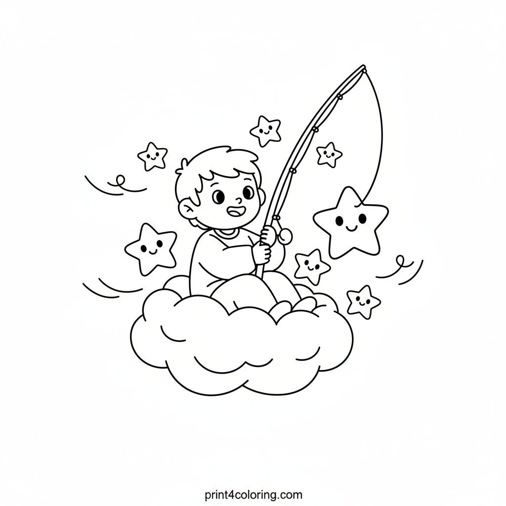 Join a sweet child on a magical adventure high in the night sky! Perched in a cozy cloud boat, they cast a line with a long fishing rod, gently reeling in sparkling, smiling stars. This enchanting scene is filled with twinkling wonders, perfect for little artists to bring to life with their favorite colors.