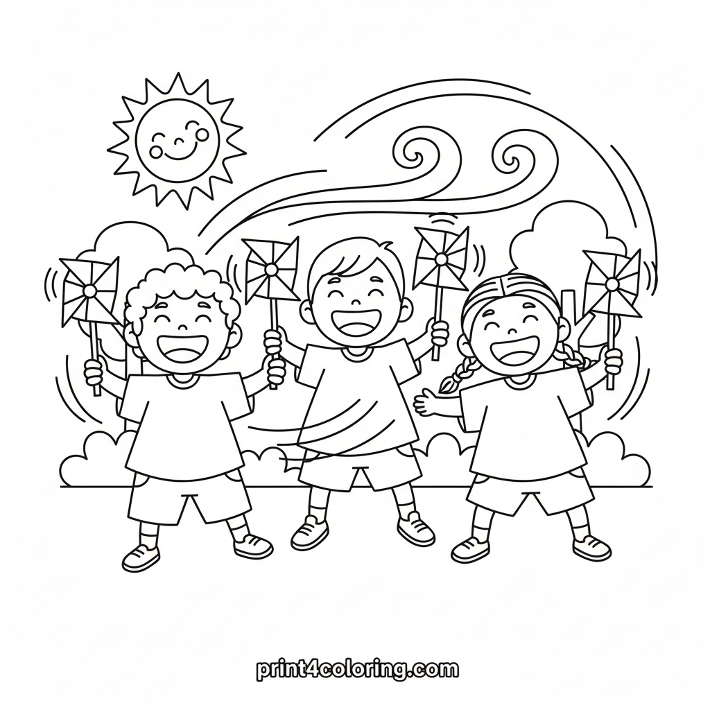 Join a group of happy children as they enjoy a perfect sunny day in the park! Watch their colorful pinwheels whirl and twirl with joy, gently spun by a playful breeze. This delightful scene captures laughter and the simple magic of childhood fun. Get ready to add your favorite colors to this cheerful outdoor adventure!