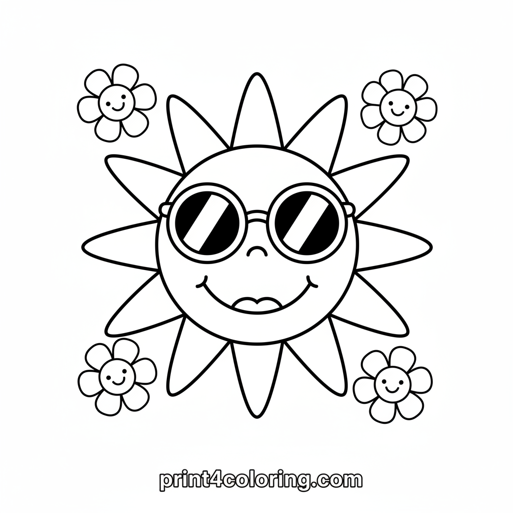 Get ready for a bright adventure! This coloring page features a big, friendly sun wearing super cool sunglasses and a cheerful smile. Surrounding our sunny friend are a few happy, simple flower blooms, just waiting for your vibrant colors. Bring this joyful scene to life with your crayons!