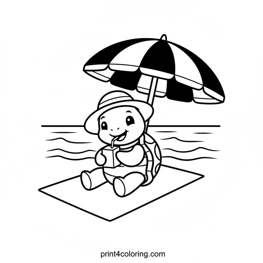 Join a cheerful turtle enjoying the perfect beach day! Our shelled friend is wearing a stylish sun hat, relaxing on a cozy towel under a colorful striped umbrella. With a juice box in hand, watch the gentle waves roll in. A super chill scene ready for your vibrant colors!