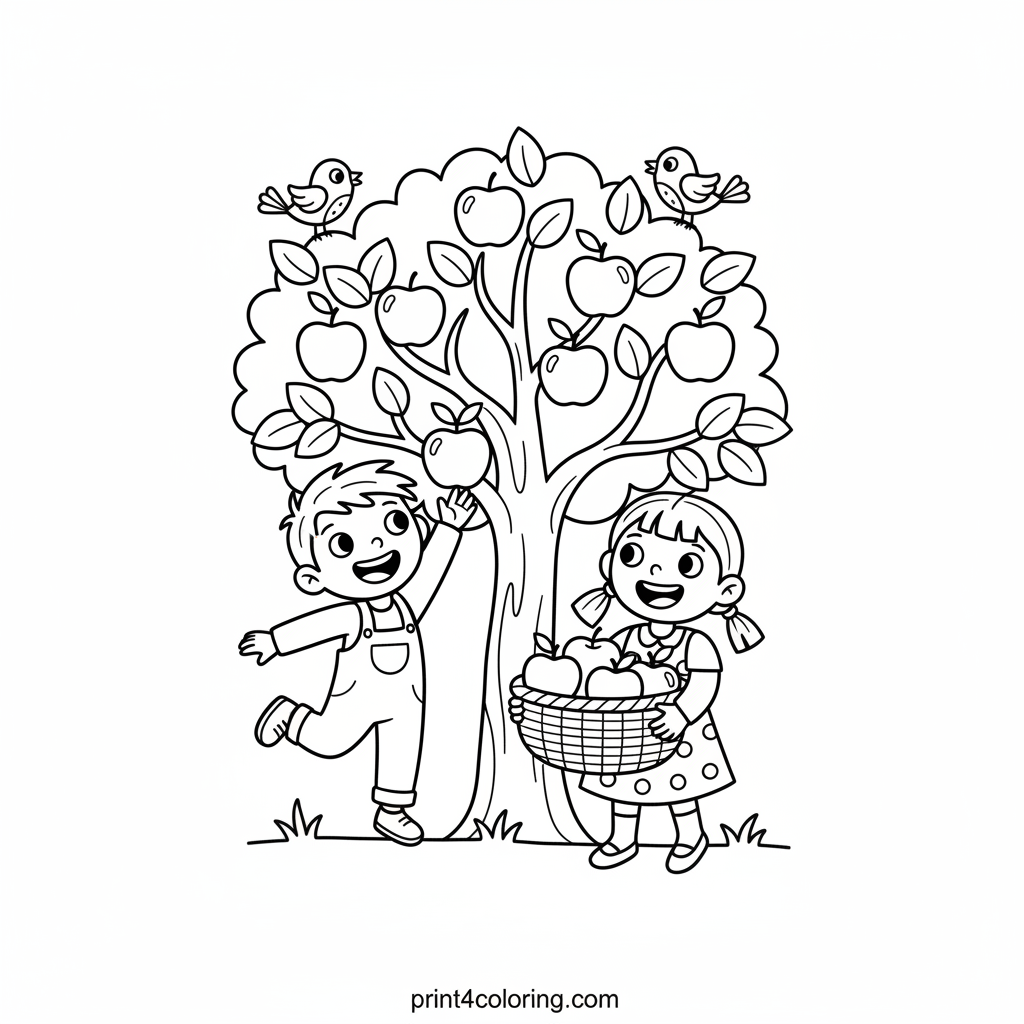 Join two cheerful friends on a delightful apple-picking adventure! One child reaches high to pluck a juicy red apple, while their companion holds a basket overflowing with fresh fruit. Friendly birds chirp from nearby branches, adding to the joyous orchard scene. It's a perfect day for coloring and imagining delicious apple treats!