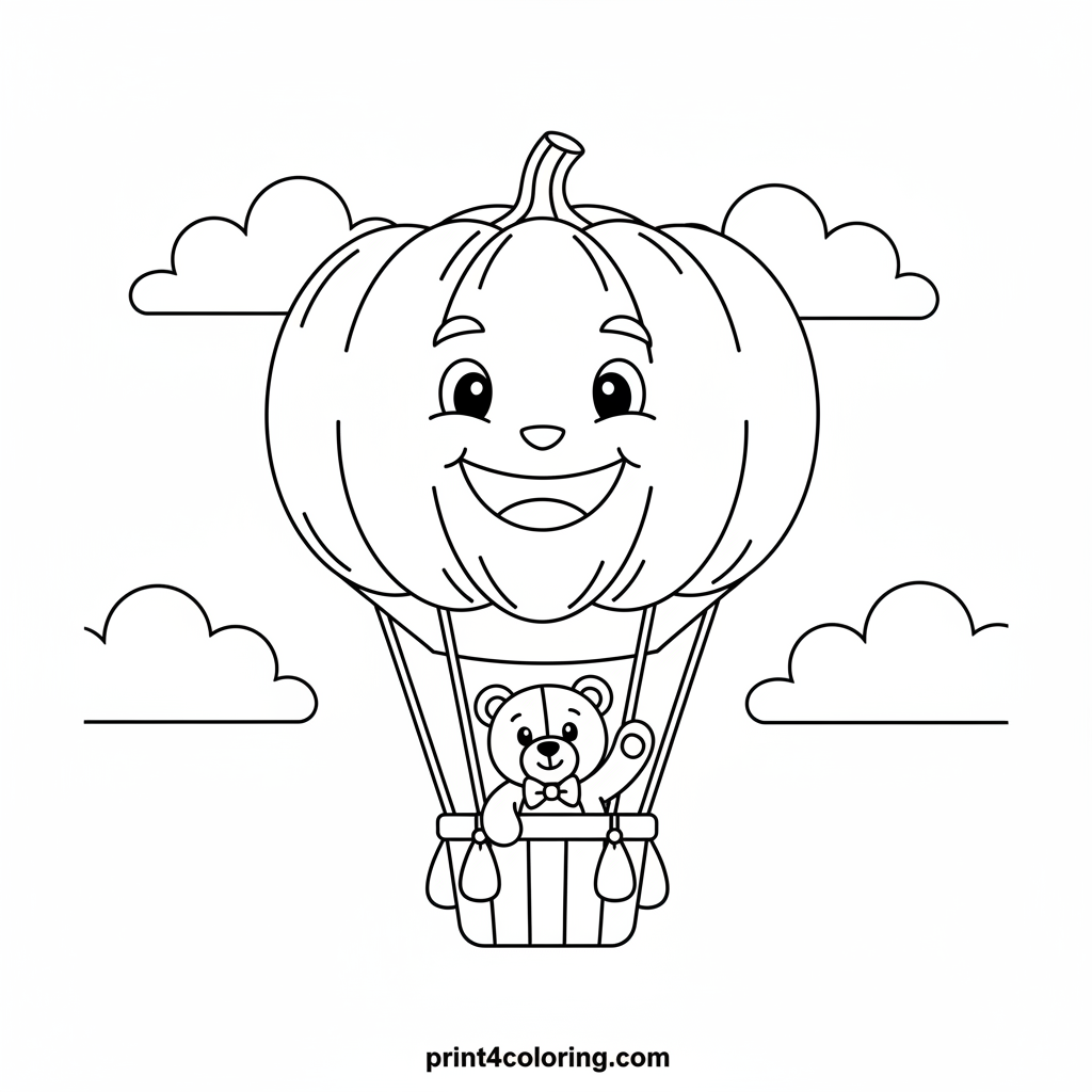 Imagine a giant, friendly pumpkin magically transformed into a hot air balloon! It's gently drifting high in the sky, carrying a brave little teddy bear in its cozy basket. This enchanting scene invites you to add vibrant colors to the pumpkin, the fluffy clouds, and the adventurous teddy's journey. A whimsical flight awaits your artistic touch!